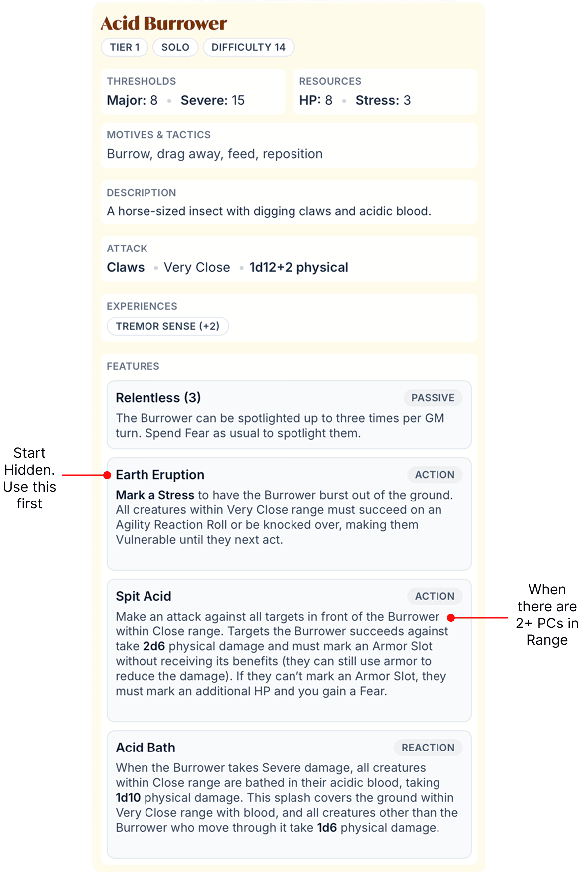 It has Relentless (3), which is huge, and sometimes trips up new GMs. Relentless allows you to spotlight the Acid Burrower three times per GM turn, but you must spend a Fear each time (unless it is the first Adversary spotlighted). This means it can potentially attack a lot.