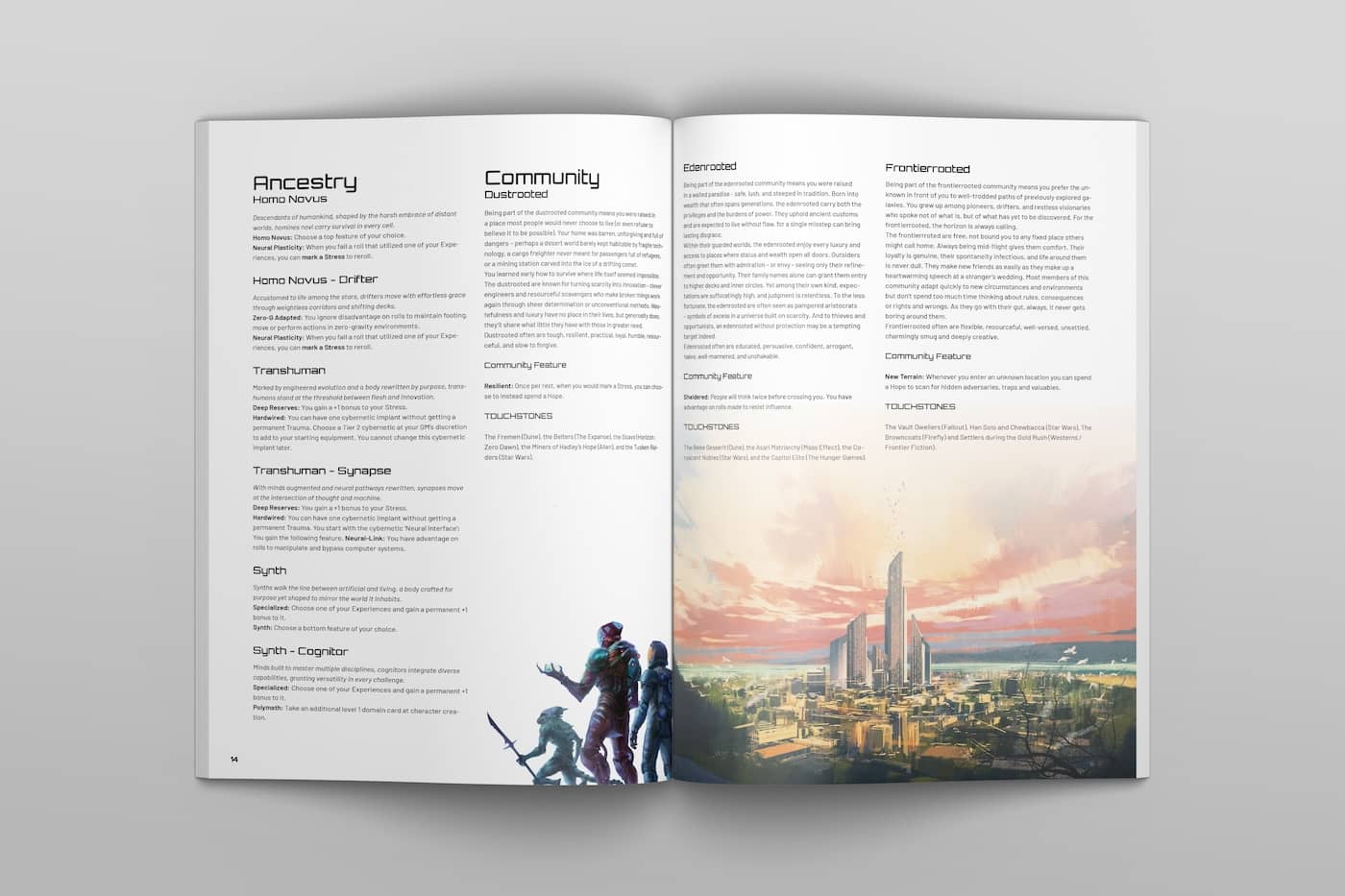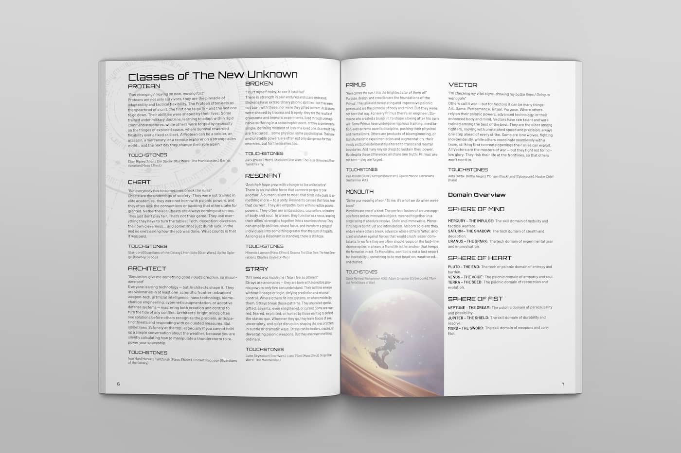 One of the difficulties with sci-fi is you need to have an understanding of science to separate the science from the fiction. To get around this, you not only break down the Classes, but give media touchstones. Something familiar, like Ellen Ripley or Luke Skywalker. Talk about how you chose the Classes, because they're one of the things players interact with the most.