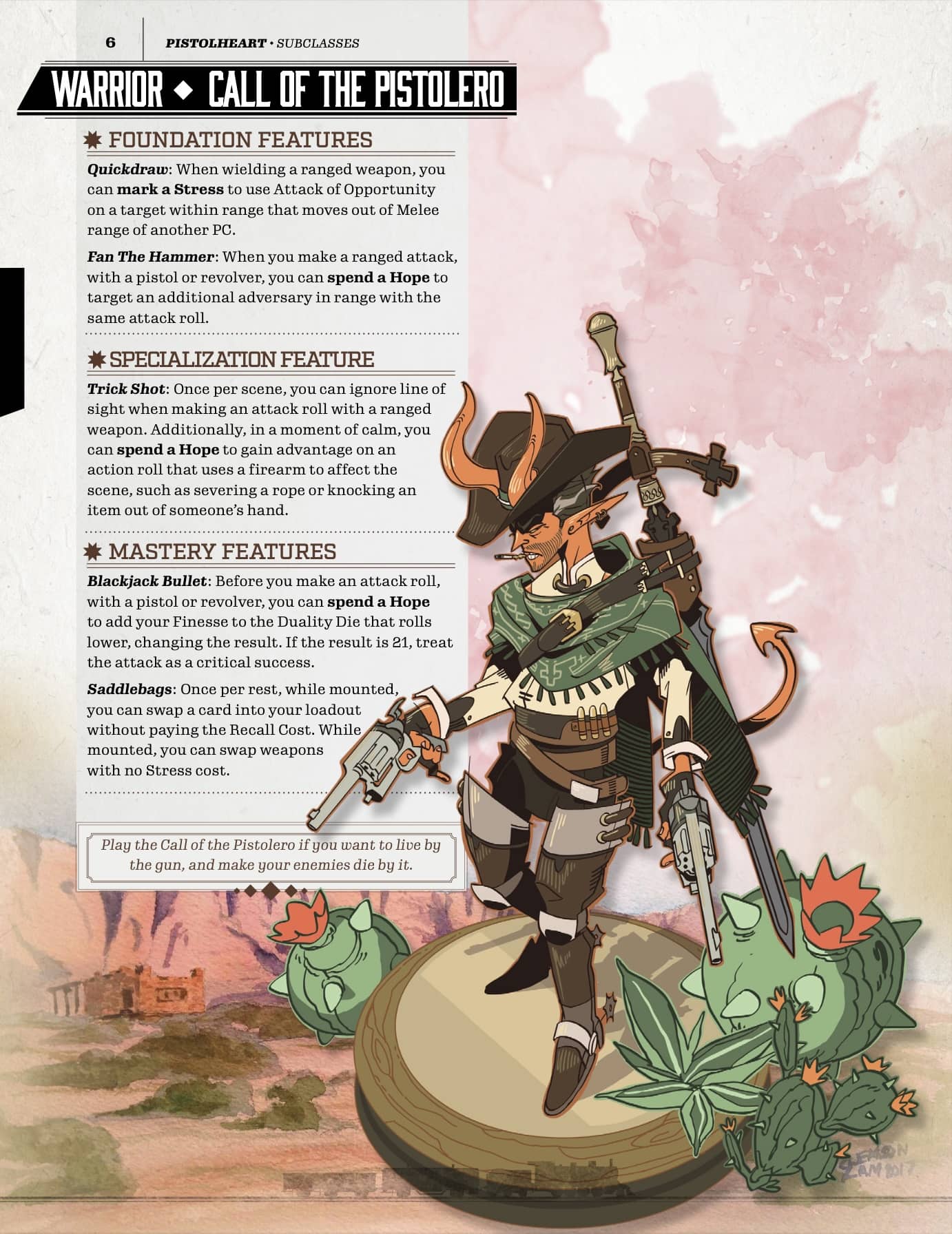The five subclasses for the Guardian, Ranger, Rogue, Seraph, and Warrior each embodying a different Western archetype. As Cisco notes: "The Breacher Guardian is a shotgun-toting, dynamite-tossing hooligan who sings when surrounded by large groups of foes. The Longbarrel Ranger snipes their foes from afar, and assists their allies with focused precision. The Outlaw Rogue is always on the move, disappearing in a cloud of gun smoke after they strike. The Marshal Seraph metes out frontier justice, and lends their abilities to their posse. Finally, the Warrior who answers the Call of the Pistolero finds no equal in a quick draw and is known for their impossible shots."