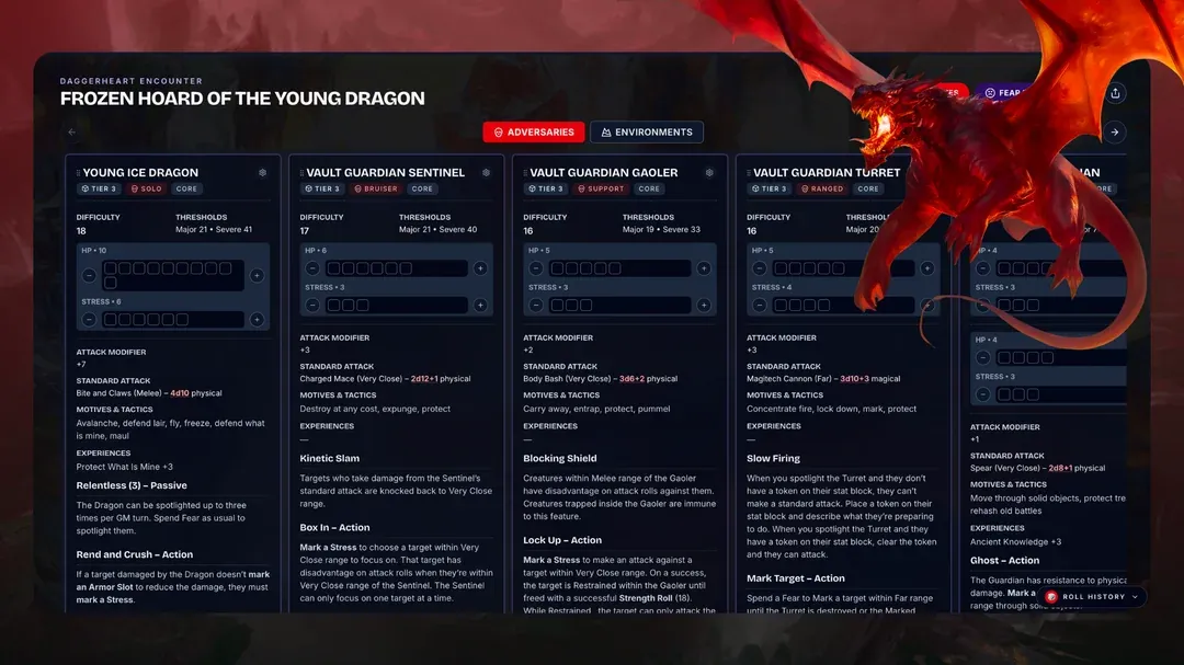 Matthew Borja’s Heart of Daggers is on tear, following up its recent Homebrew Vault with an integrated Encounter Manager that includes just about every feature of FreshCutGrass—and doubles as a GM screen with native Countdowns, Fear tracker, 3D dice roller and loot generator. And there’s more to come. They’re currently working on an Adventure Builder for shareable (and sellable, likely) one shots and adventures where you can add chapters and acts that link to Encounters, core and homebrew adversaries, maps, and images. It’s part World Anvil, Obsidian, FCG, and DriveThru and it’s either going to be a mess or a defining tool of the Daggerheart community.