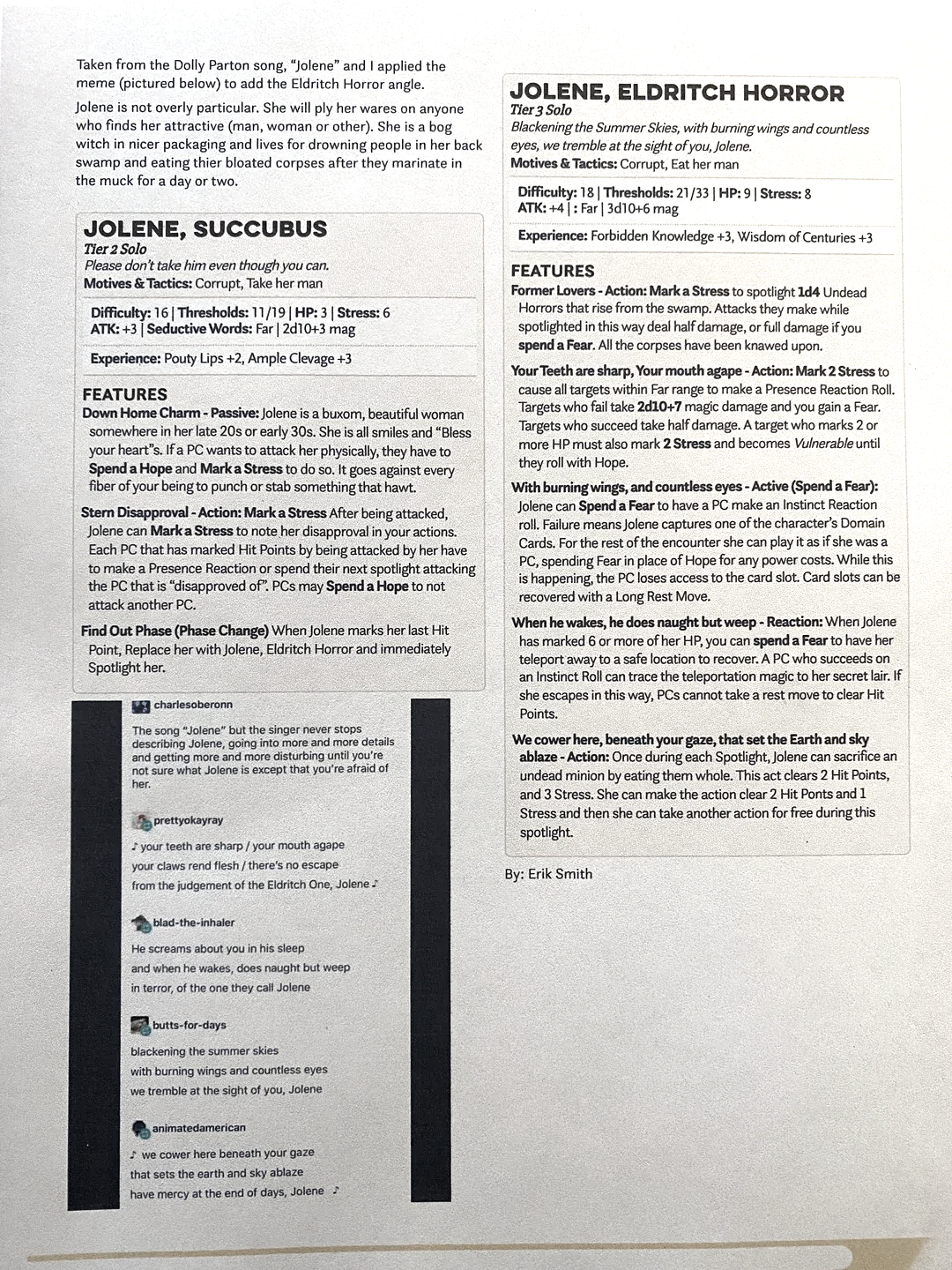 Dolly Parton may not have imagined her antagonist as a bog witch, but thanks to Tumblr and Erik Smith, we have a transformational Adversary, appearing first as a buxom woman aiming to steal your man, then mutating into a Tier 3 Solo who rips and rends before drowning you in a swamp and eating your bloated corpse.