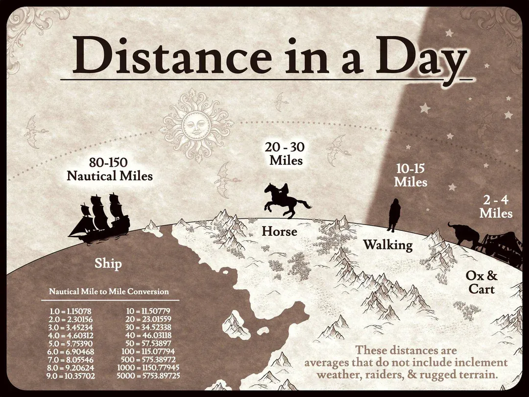 Over at Inkarnate, @7LegionArmy designed a handy reference to estimate travel time as your adventurers move from ship to shore to Shire. Here's the file.