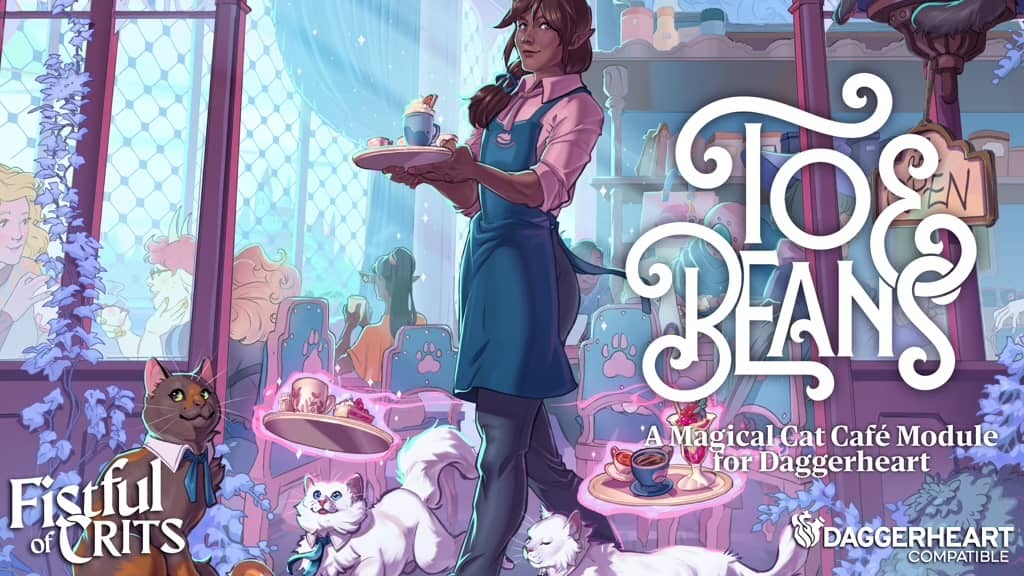 Cats? Cafes? Magic? That’s the pitch behind the upcoming Toe Beans Kickstarter, a cozy drop-in/one-shot from Steph and Logan at Fistful of Crits, artists and designers from the UK’s northern reaches. The upcoming module promises a scholarly cafe owner, a herd of magical cats, social encounters—and IRL recipes for your group. Add adorable artwork and you’re set for a rainy day.