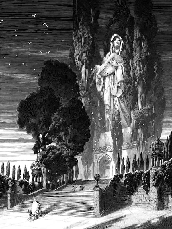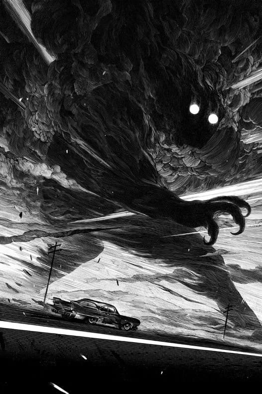 Parisian artist Nico Delort’s epic scratchboard illustrations sit at an intersection of folklore, cosmic fantasy, and woodcut tradition—ominous and reverent rather than violent or flashy. Partly this is their composition and scale, but it’s chiaroscuro that sells the mythic grandeur and stops you in your tracks. Sometimes I see work and do the Liz Lemon “I want to go to there.” But Delort’s work feels like it’s inside you, dark thoughts and grand ambitions just waiting to stir.