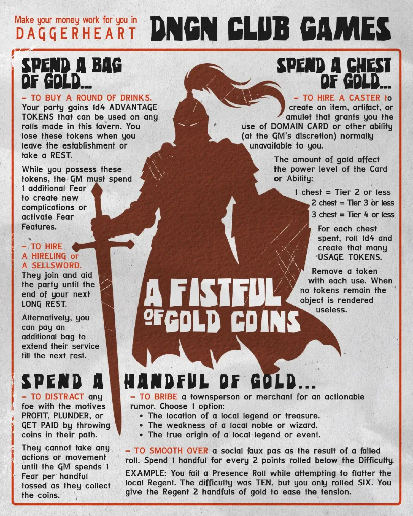 (Certainly the Jack Panic way, who at this point is spitballing a new entry into the Daggerheart canon every other week. Fistful of Gold Coins joins Make Camp which joins The Wandering Tavern which…yeah. Manic output from Mr. Panic. And worth every second of your time.)